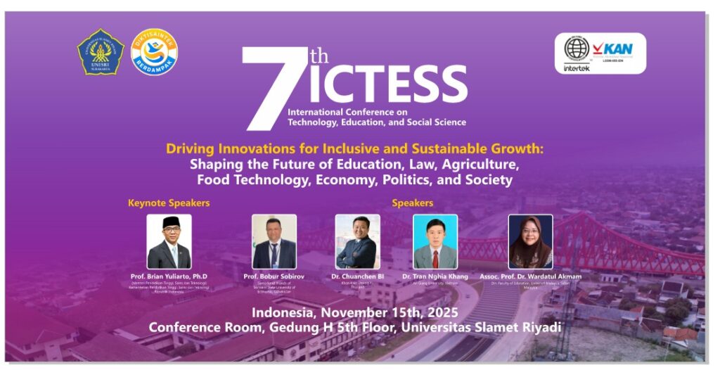 Program Studi Pendidikan Bahasa Inggris Universitas PGRI Yogyakarta (PBI UPY), yang dalam pengembangannya senantiasa menerapkan slogan ASIK (Adaptive, Sustainable, Innovative, Knowledgeable) sebagai semangat untuk meningkatkan kualitas akademik dan kontribusi global yang relevan, menghadiri Konferensi Internasional yang diselenggarakan oleh Universitas Slamet Riyadi (UNISRI) secara daring. 7th International Conference on Technology, Education, and Social Science (ICTESS) 2025 ini dilaksanakan pada Sabtu, 15 November 2025. Konferensi internasional tersebut berfokus pada penguatan inovasi global yang inklusif dan berkelanjutan untuk menjawab tantangan dunia pendidikan, teknologi, sosial, dan pembangunan modern.